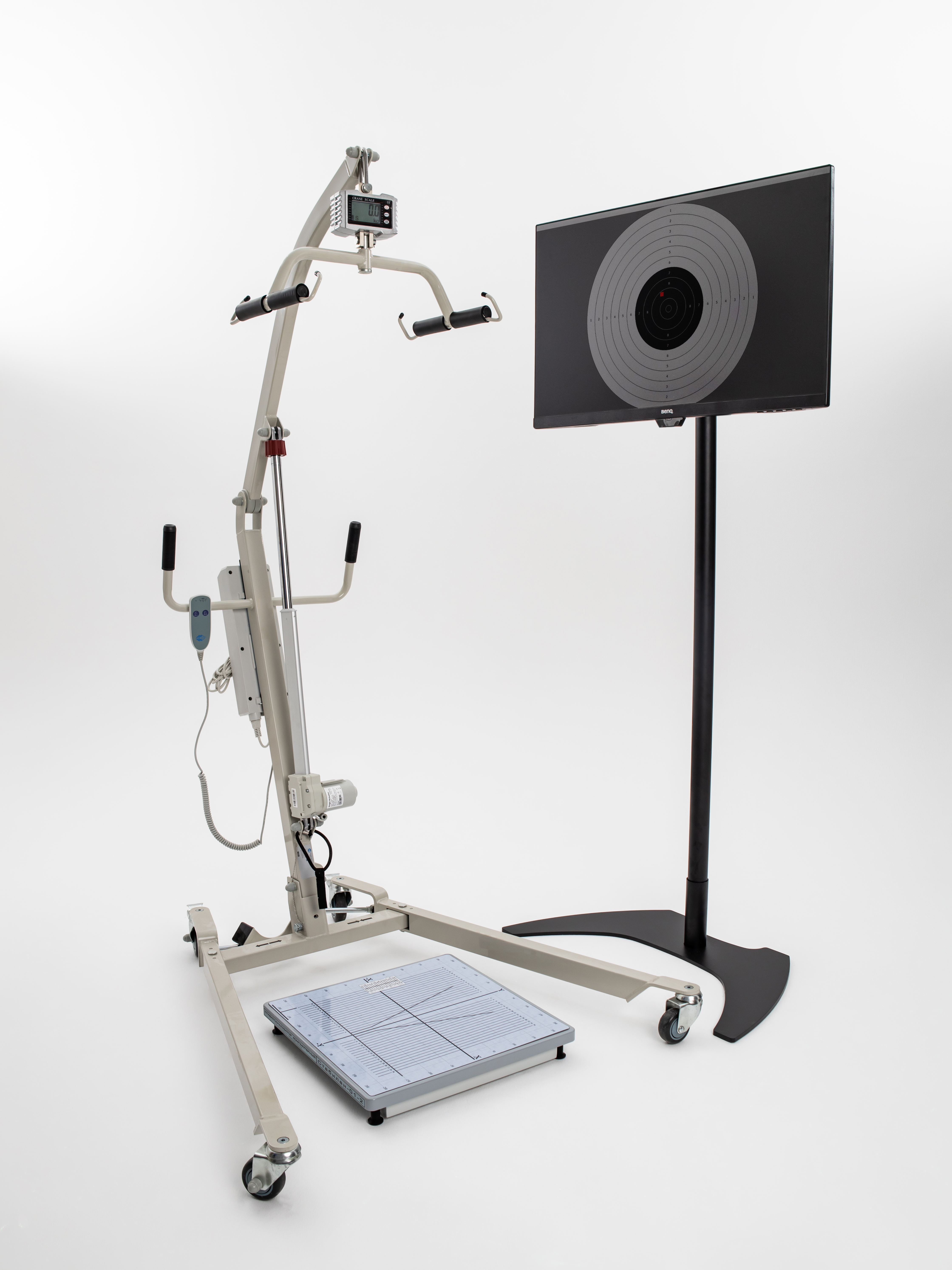 б) оценить влияние на регуляцию позы и функцию равновесия дозированной произвольной проприоцептивной нагрузки, осуществляемой посредством сжатия стоящим на стабилоплатформе человеком засинхронизированного со стабилоплатформой цифрового кистевого силомера или тяги за рукоятку станового силомера;