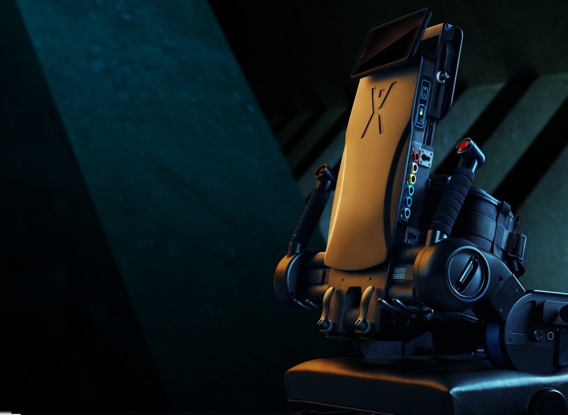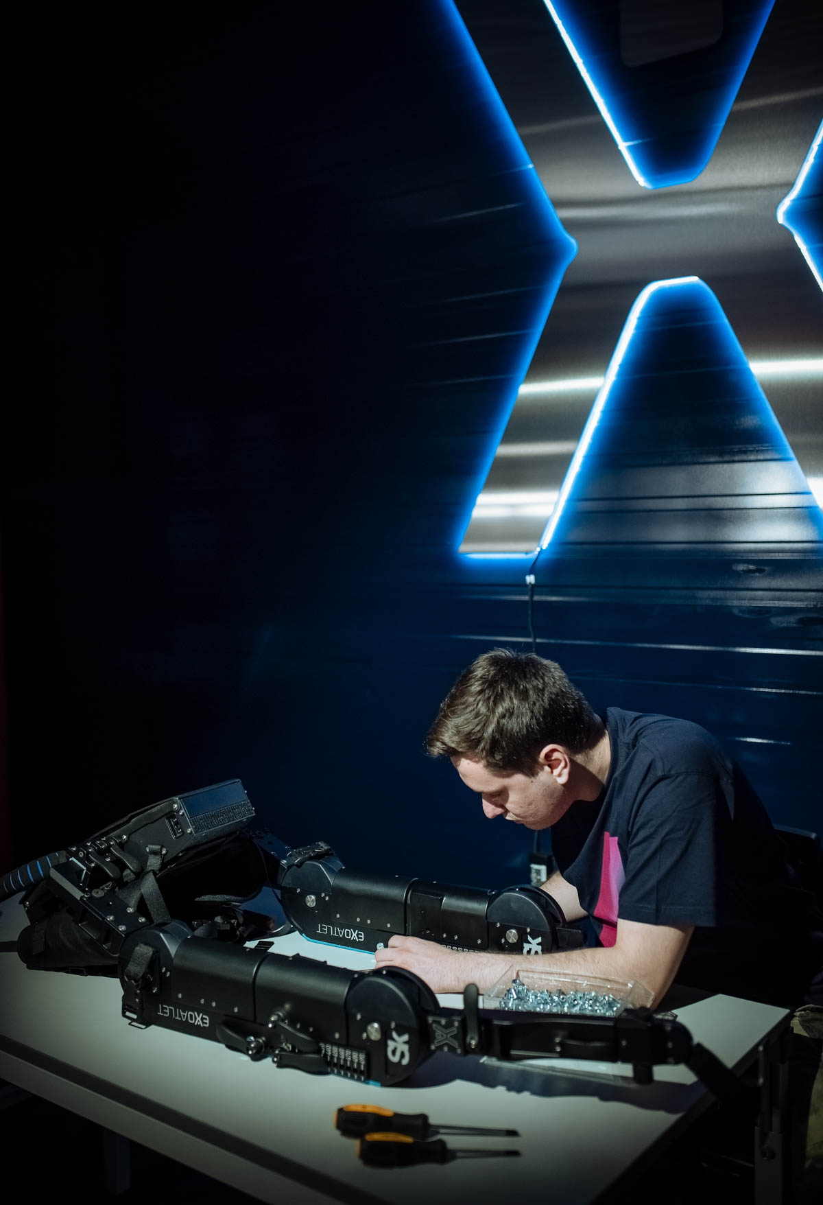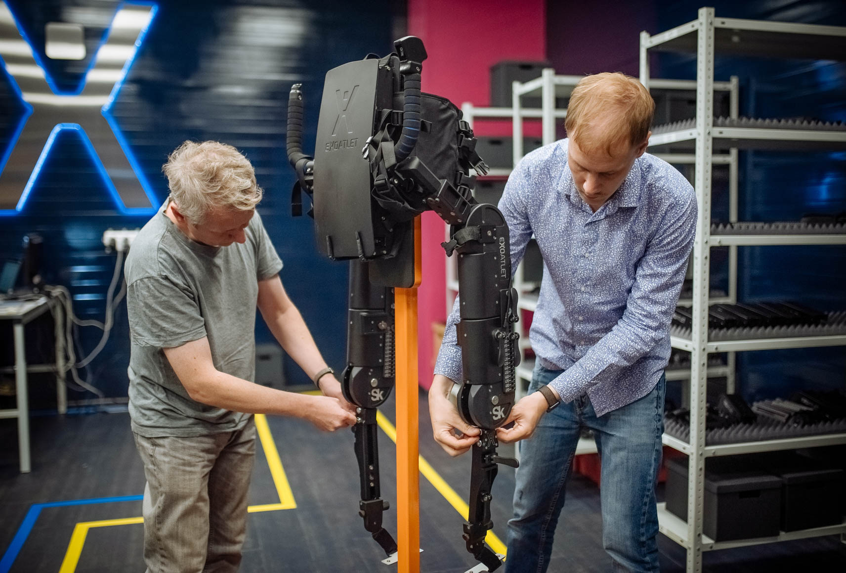 Движения экзоскелета формируются электродвигателями, расположенными в коленных и бедренных модулях конструкции, управление которыми осуществляет центральная плата, расположенная в рюкзаке аппарата.