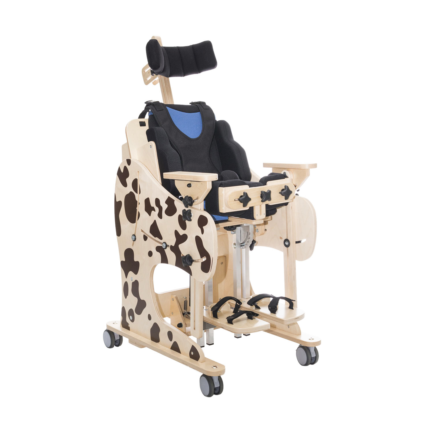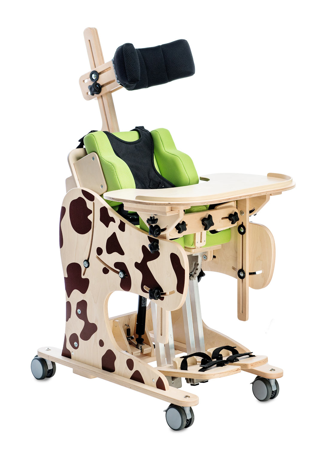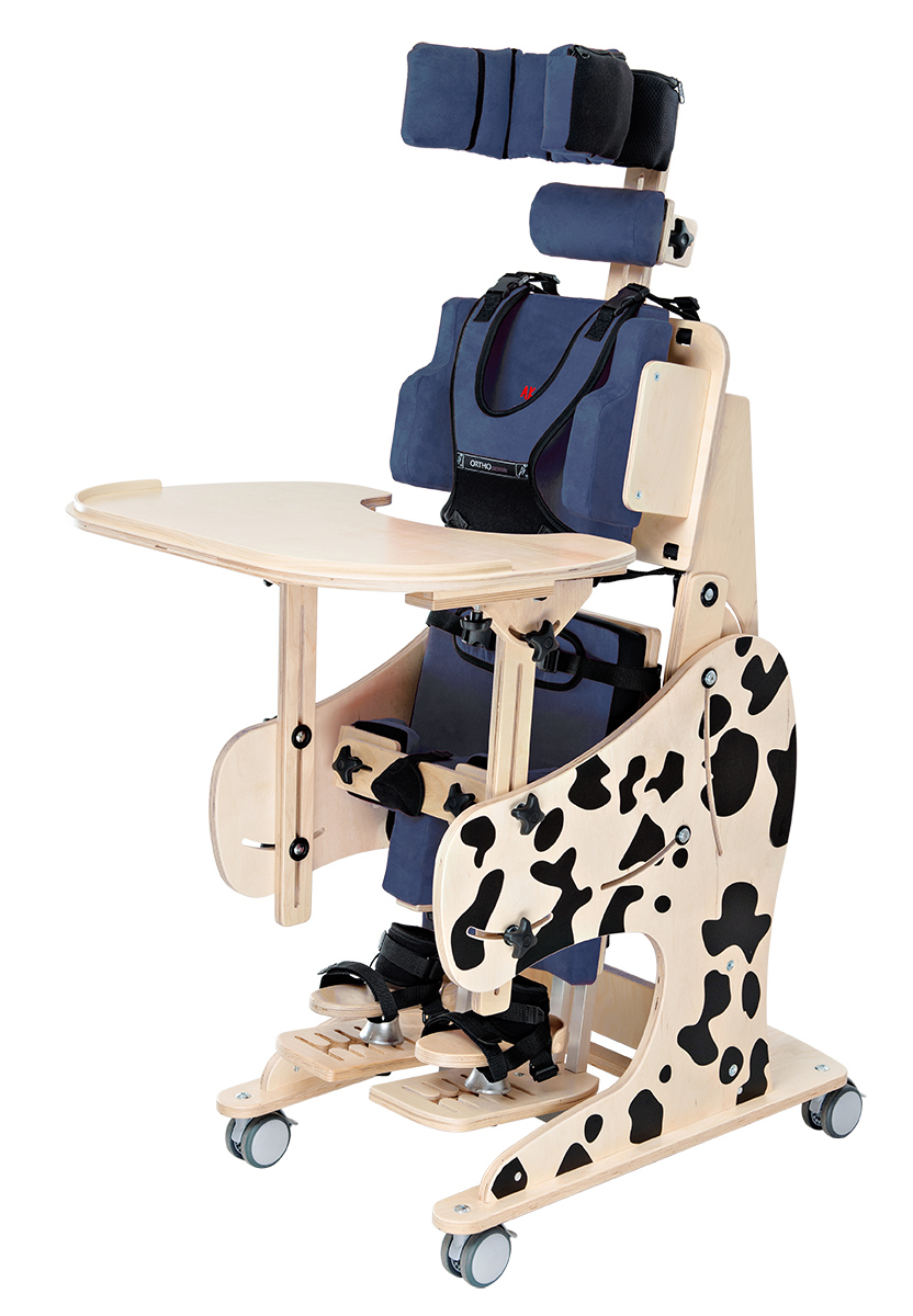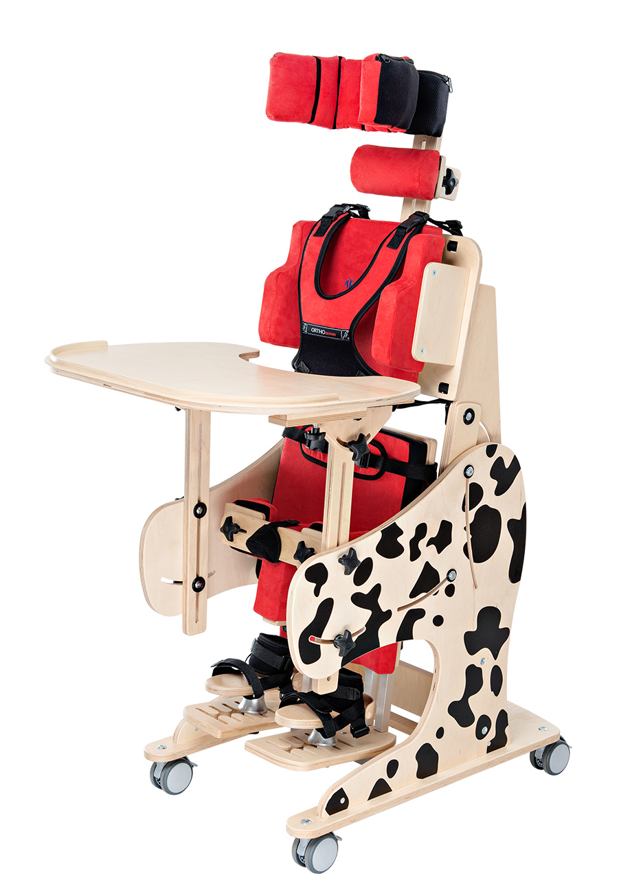 Благодаря своей многофункциональности, большим возможностям регулировки и комплектации оно комплексно помогает в реабилитации детей и подростков. Вертикализация происходит в границах от 0 до 90 градусов. Жилет безопасности и бедренный ремень имеют инновационные застежки типа «возьми и потяни», позволяющие мгновенно и точно пристегнуть ребенка в устройстве. Продукт изготовлен из экологичных материалов, а покраска полностью ручной работы.