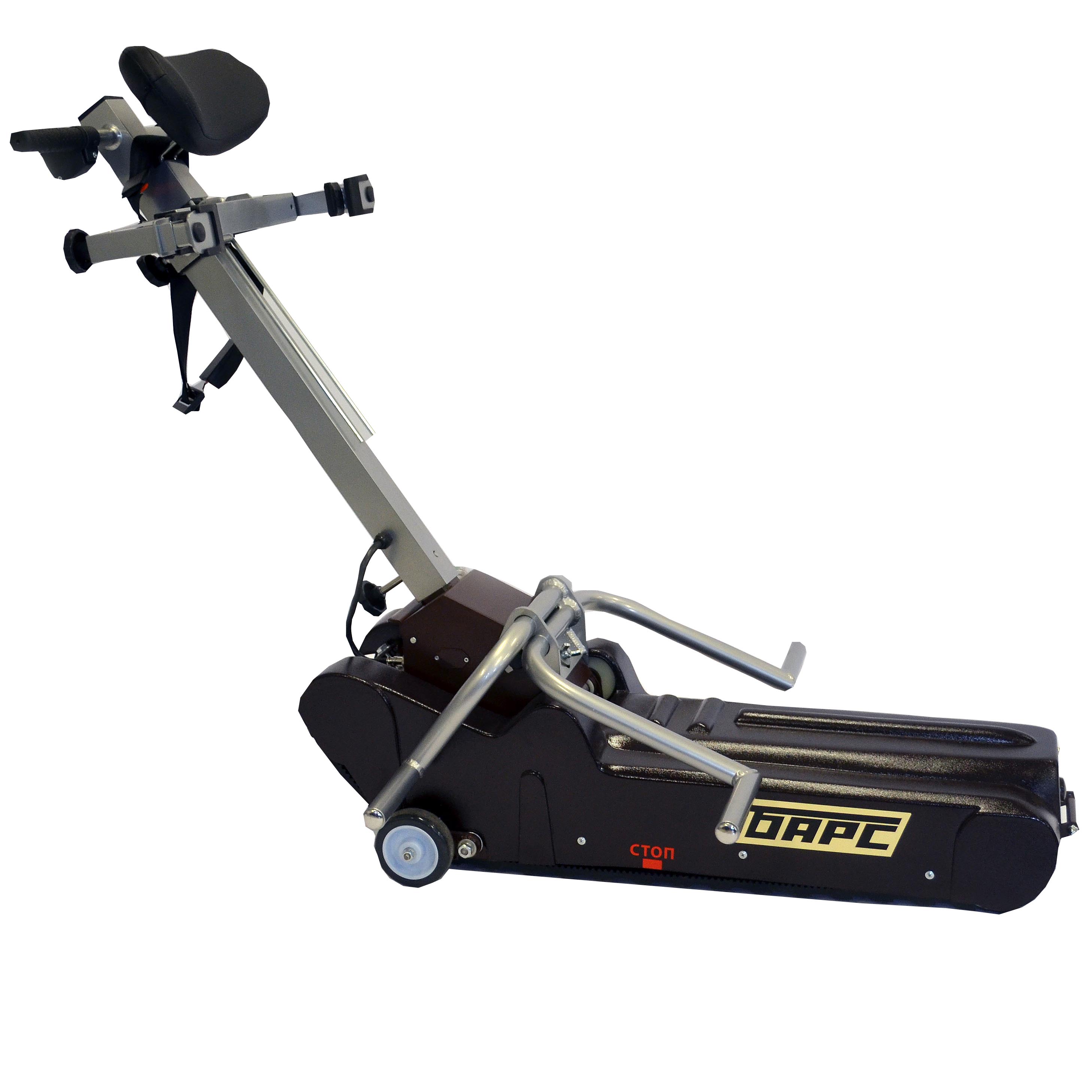 Барс-УГП-130 – представляет собой переносное мобильное устройство, обладающее крепежным соединительным механизмом для подсоединения к своему корпусу инвалидных кресел, встроенным в корпус устройства электрическим приводом, а также специальную двигательную базу на гусеничном ходу, благодаря которой устройство преодолевает ступеньки, осуществляя движение за счет зацепления выступов двух резиновых гусеничных лент устройства и соосного движения гусеничных лент по ступеням.