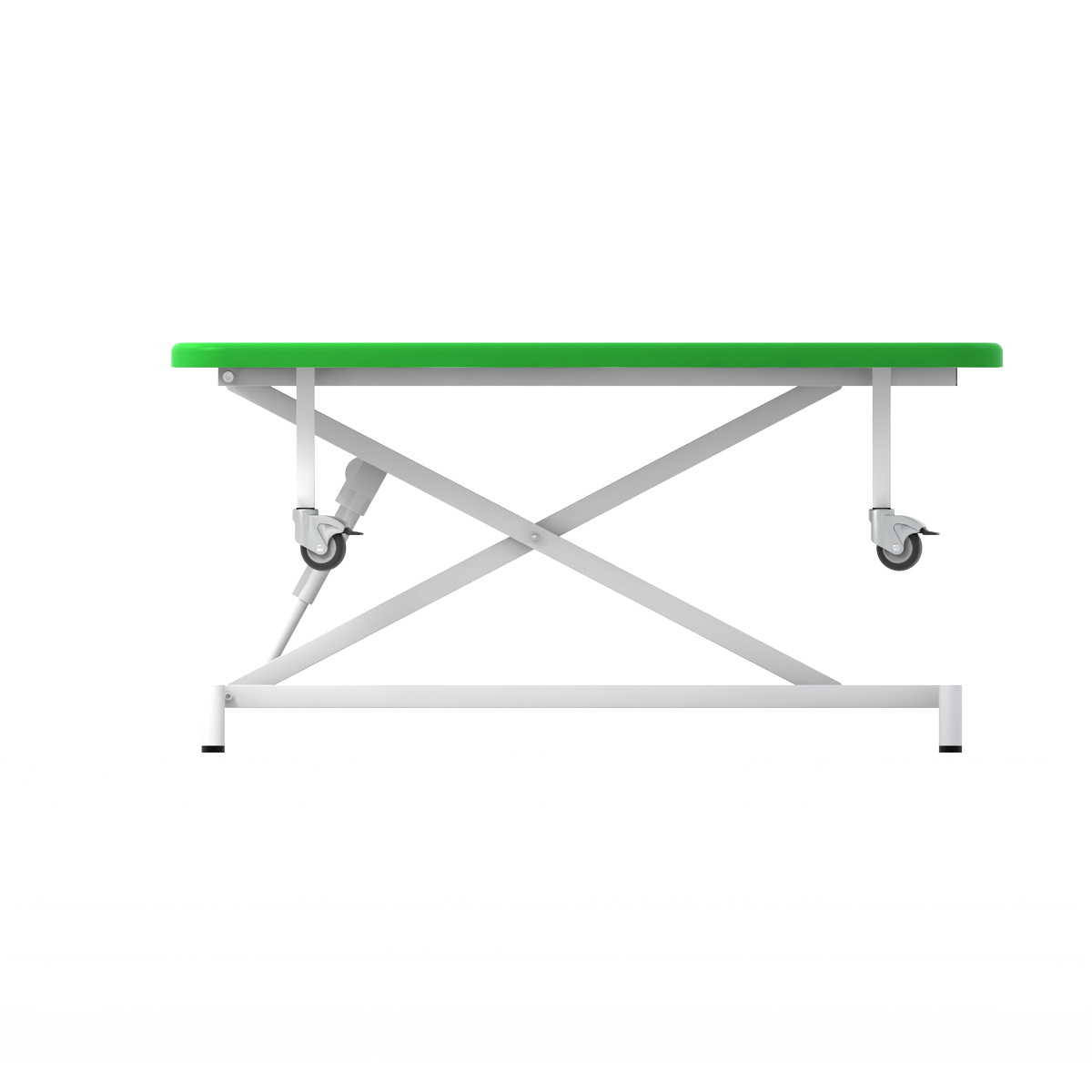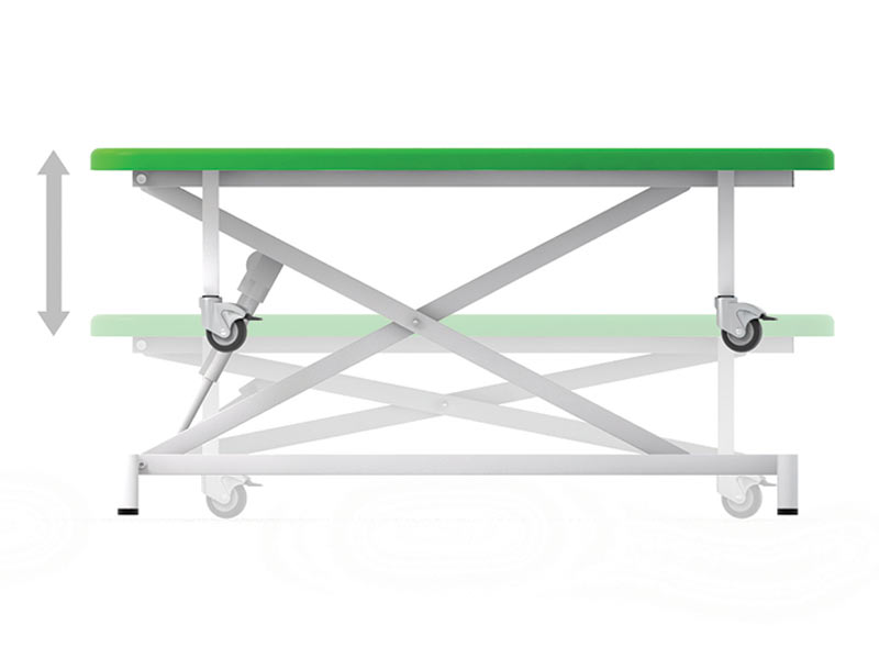 - Стол имеет два положения: транспортное (на колесах) и рабочее (на ножках). При проведении процедур колеса убираются и стол жестко встает на ножки.